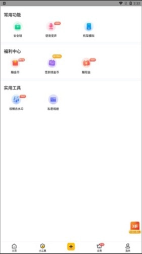 其次还有福利中心和实用工具,具体包括赚金币、签到领金币、赚现金;视频去水印、私密相册。
