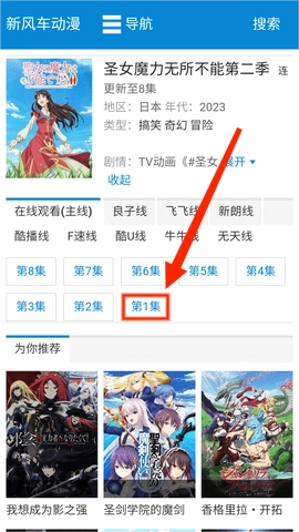 3、于搜索结果里点击该动漫,进入详情页面,接着点击想要观看的剧集,比如第一集。
