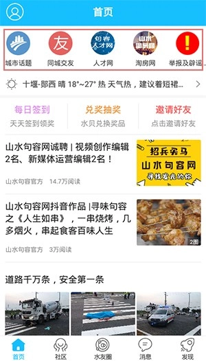 1. 在本站安装山水句容网软件,于手机上运行该软件后,能看到包含首页、社区、水友圈、消息、发现这五个板块。