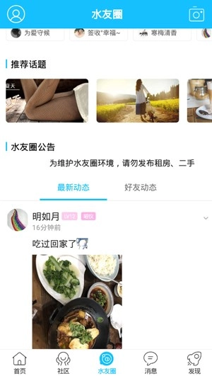 4、打开水友圈,其中包含交友、邂逅、话题、附近等板块,同时还能够查看其他用户所发布的动态。