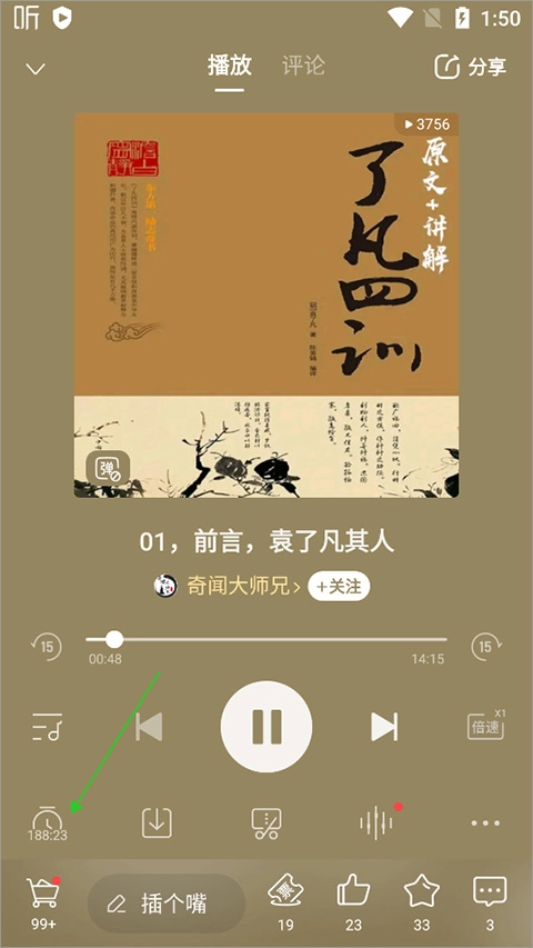 2. 在音频播放界面,点击【小闹钟符号】就能进行开启或关闭的设置。