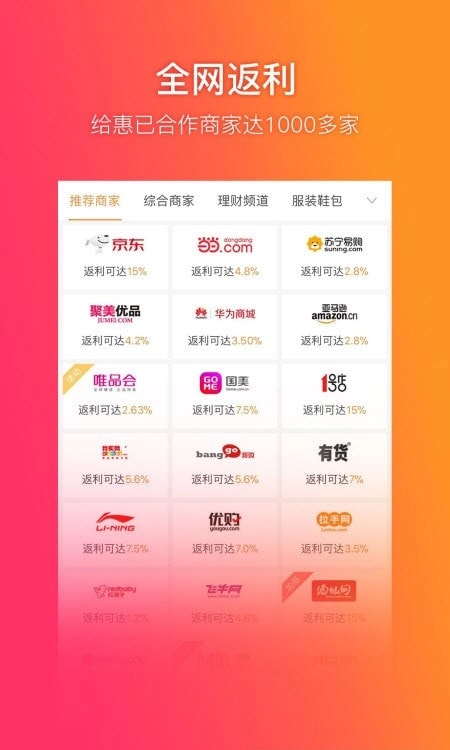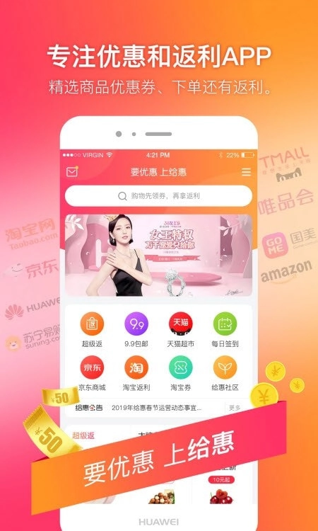 给惠网手机版,作为一款省钱神器,能让你直达国内电商与海外商城,海量商品任你挑选,同时还能享受超级返利,助你轻松省钱。