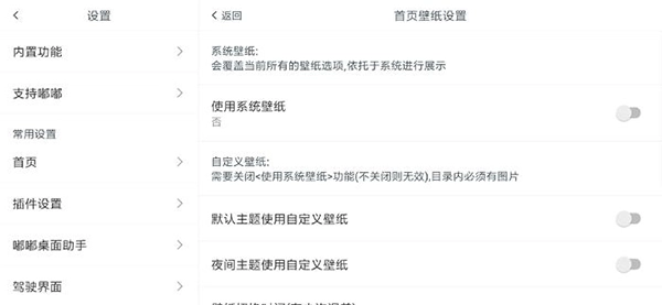 【首页设置】涵盖了{插件调整}、{插件其他设置}、{主题切换模式}、{应用图标}、{布局}、{壁纸}、{警告}、{状态栏设置}以及{其他设置}