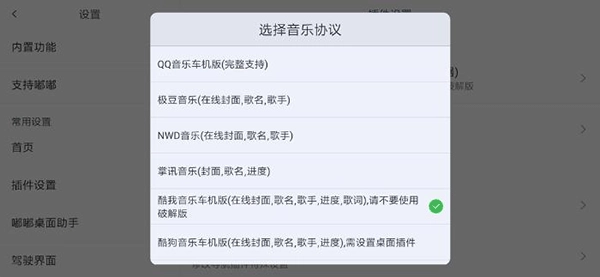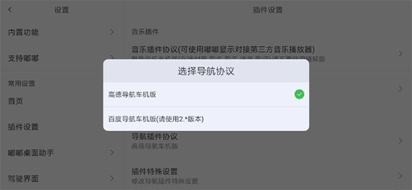 3、{导航插件协议} 目前可选择支持的百度地图车机版和高德地图车机版,不过百度地图车机版早已停止更新,因此推荐使用高德地图,能获得更完善的功能支持。