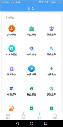 3、在【服务】页面,为用户提供了就业服务、水电费缴纳、医疗服务等,还包括申请法律服务,以及企业招聘、车票预订、公交查询、话费充值等第三方服务。