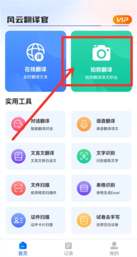 1、于本站下载并安装风云翻译官,进入首页后,点击上方的在线翻译按钮或者拍照翻译按钮,就能迅速开展翻译。