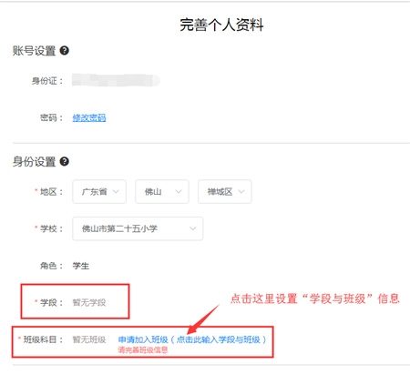 3、对“个人资料”进行完善,妥善设置“学段与班级”相关信息。
