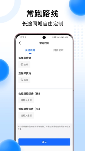1、司机可以设置自己的常跑路线,编辑运输往返的地址。