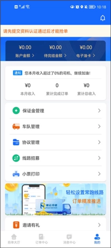 5、在我的功能中,不仅提供了保证金管理,还有车队管理、协议管理,司机们使用之前可以阅读管理制度,并且邀请好友上线还能获取不少的零钱。