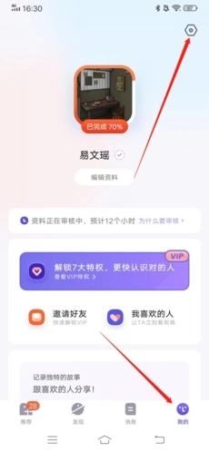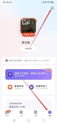 1进入页面后,第一步点击右下方“我的”,紧接着点击页面右上方的“齿轮”图标。