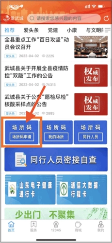 1. 先将爱武城更新至最新版本并完成安装,接着在首页找到并点击“场所码申请”。