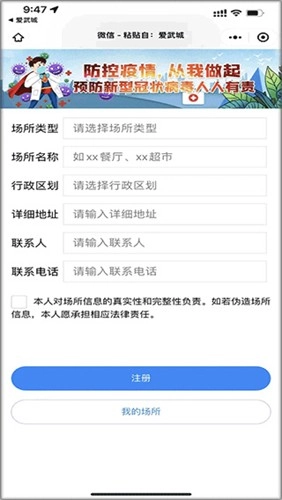 2、页面打开后,按照要求填写申请场所的相关信息。填写完毕,点击“注册”,申请即完成。