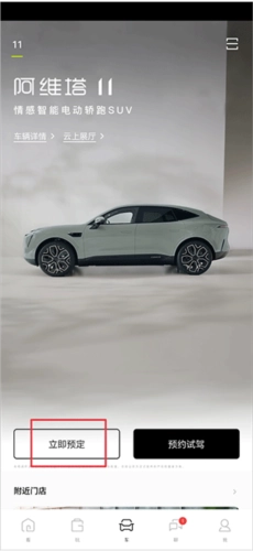 1. 开启阿维塔汽车,于车辆界面上点击“立即预定”。