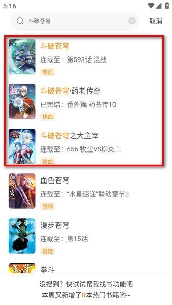 例如搜索《斗破苍穹》,如以下图示,会呈现多个结果,通常能够搜索到与该系列相关的内容。