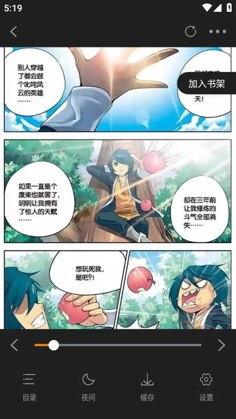 看漫画的界面如下图所示,可进行上下滑动操作。点击界面,还能选择目录、夜间模式、缓存以及设置等功能。