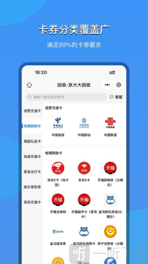 京大大回收,作为一款专注于充值卡券回收服务的生活实用类软件,涵盖了丰富多样的卡种回收业务。无论是话费充值卡,还是电商购物卡、商超礼品卡等,都在其回收范畴内。借助这款软件,你可以便捷地将手中的各类卡券进行回收变现,从而轻松赚取额外收益。
