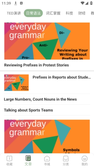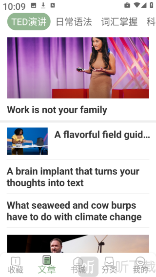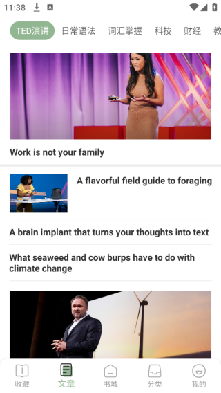 2. 随后点击下方的“文章”,便能看到各类热门的TED演讲。
