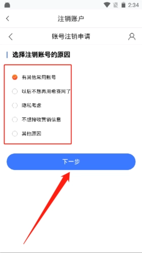 4、在选择注销原因之后,接着点击“下一步”。