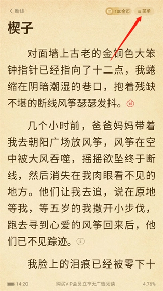 2. 当进入小说阅读界面时,点击界面右上方的菜单。
