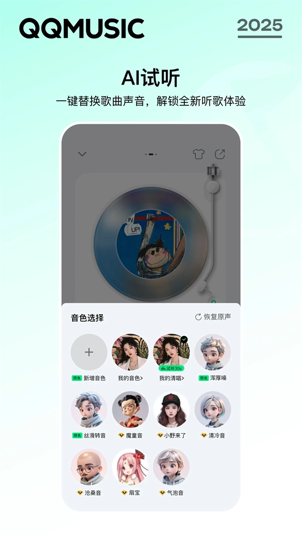 「AI试听」功能新增,一键替换歌曲声音,解锁全新听歌体验。