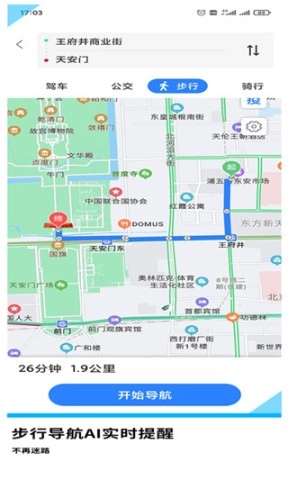 2、输入从【王府井商业街】到【天安门】的路线,点击【开始导航】便可开始您的出行冒险。