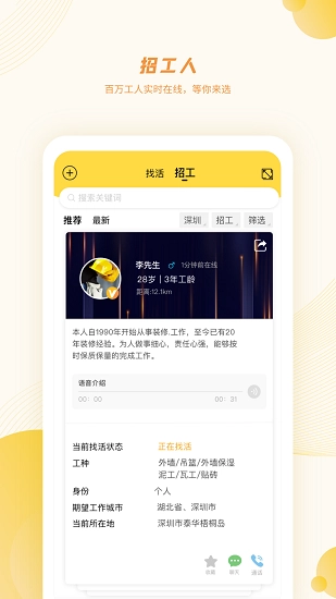 招工与找活信息海量且实时更新,精准对接招工及找活需求;打造和谐安全的务工经验与生活分享社区;提供智能记工记账及班组管理服务。