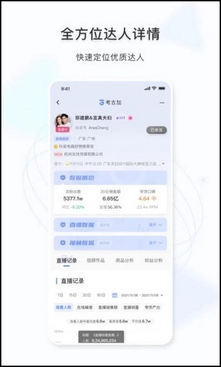 考古加是一款聚焦于抖音数据的专业分析平台软件。此平台深耕抖音生态领域,为用户提供覆盖抖音全场景的数据分析服务,涵盖专家、直播、产品、店铺、视频、热点、榜单等多个维度,达成对数据的全面剖析。这难道不比你那月薪三千的实习生更专业吗?更何况,这款应用程序还具备独有的特殊数据指标。