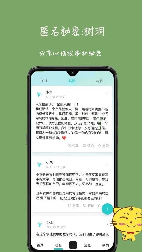 3、收信提醒功能:能够自行设定收信日期的提醒模式,临近设定时间会自动推送,保证不会错过与未来的约定。4、匿名悄悄话功能:这是一款完全匿名的社交应用,你能够私信朋友,发送文字与图片,对方无需额外操作即可接收信息。