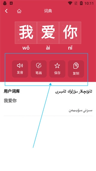 4、点击后,下方会呈现出一些其他语言,还包括发音、笔画等内容,便于我们在线学习。