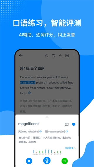 智能评分系统具备逐句跟读以及词级评分功能,能够助力用户克服口语方面的障碍,有效提升口语流利度。