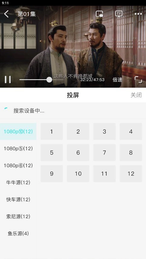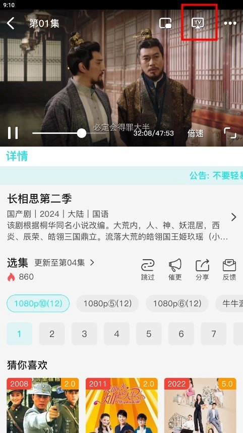3、点击想要看的影片,在播放页面的右上角有一个TV图标,点击可以搜索设备投屏。