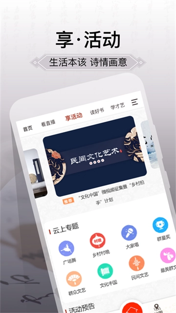 2、共享直播:为你呈上最为高清且全面的文化直播观赏服务。