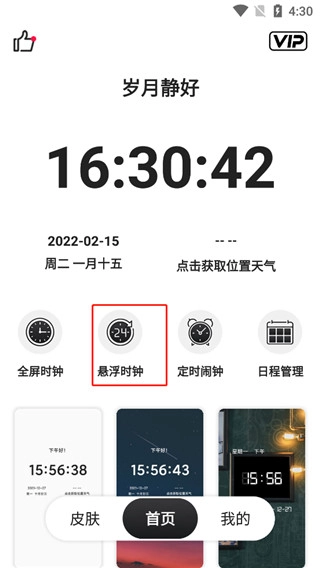 2、如图所示为首页,包含全屏时钟、悬浮时钟、定时闹钟以及日程管理功能,下方则是各类皮肤主题。