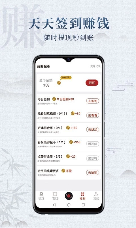 【赚钱福利大放送】每天来看看戏、听听戏,顺便刷刷视频,就能领取现金和福利,简简单单就能省下买菜钱。