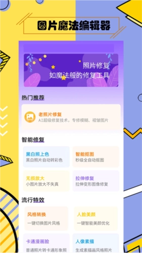 多功能照片修复旨在帮助用户以轻松便捷的方式修复照片,同时配备了多样的编辑功能与创意工具,助力用户尽情发挥创意进行创作。不管您是希望修复承载着往昔回忆的老旧照片,还是提升现有照片的品质,这款应用都能完美契合您的需求。赶紧来体验这款功能强大且便捷的照片修复工具吧!