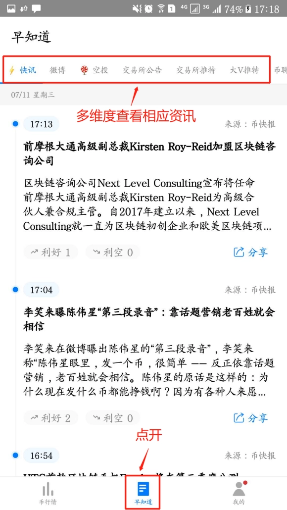 1. 开启MyToken,点击进入“早知道”页面,便能查看区块链资讯。