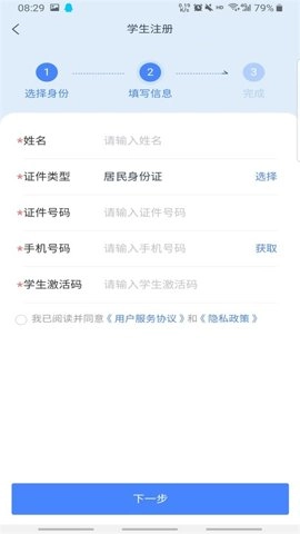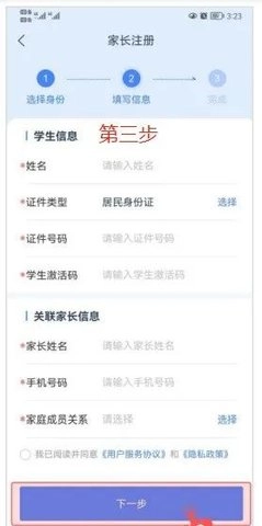 先选择家长身份选项,接着点击页面上的“下一步”按钮,进入信息填写界面后,把“学生激活码”这类关键信息准确录入进去。