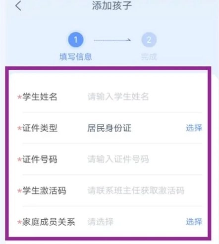 进入添加子女的操作页面后,需准确录入子女的相关资料以及对应的学生激活凭证,完成这些信息填写后,点击后续的操作按钮即可完成子女账号的重新关联流程。