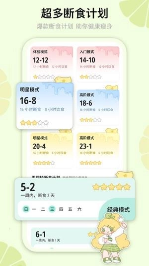 当下全网备受关注的轻断食方案这里都有,像16+8、12+12、14+10、20+4、18+6这些热门模式,还有经典的5+2轻断食,涵盖了各种火爆的轻断食计划,能帮你在短期内快速瘦身,让多余的肉肉都消失不见~