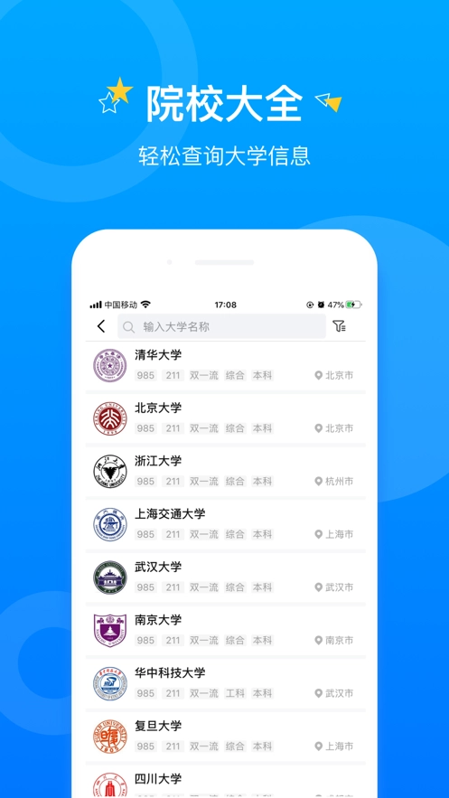 [院校大全] 涵盖全国2700多所大学的录取分数线、招生计划详情、师资力量情况、奖学金政策等各类信息