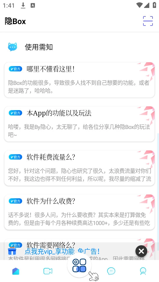 隐Box是一款超级多功能的App,了300多款实用工具,涵盖迷路指南、心情解压、记账助手、荣耀爆料等丰富功能!这款App不仅内存占用小,而且实用性和可玩性都很高。用户可以轻松在隐Box里找到并使用自己需要的小工具,这里提供了多样的查询功能,工具操作也十分便捷,感兴趣的朋友赶紧来体验吧!