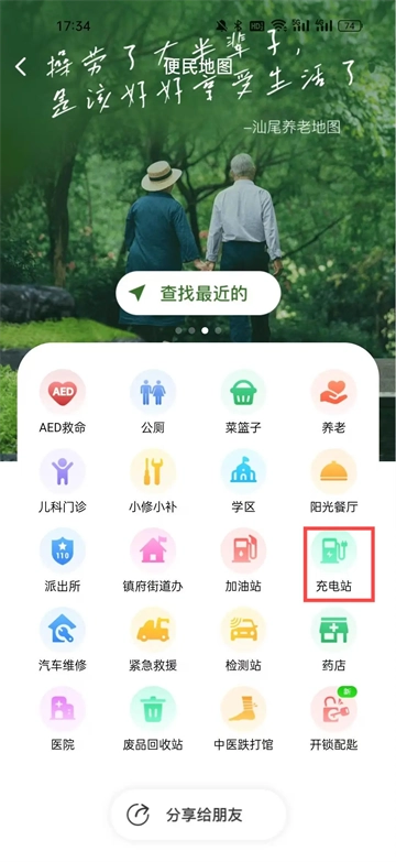 打开“i汕尾·爱生活”首页,点击“便民地图”选项,在其中找到“充电站”图标。