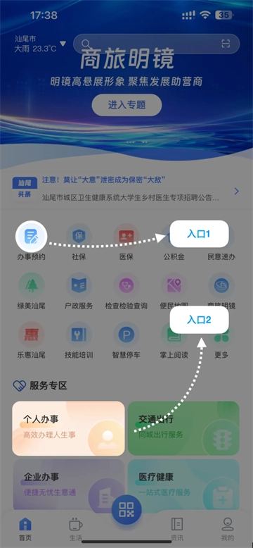 01点击首页的“办事预约”图标,或者通过“个人办事”专区进入该栏目。