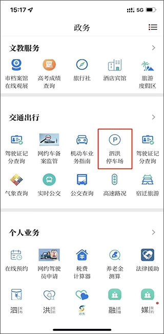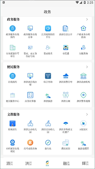 点击进入爱泗洪平台,待进入主页后,点击页面下方的“政务”选项进入对应模块,该模块包含政务服务、便民服务、文教服务、交通出行、个人业务、建言资政六大板块内容。