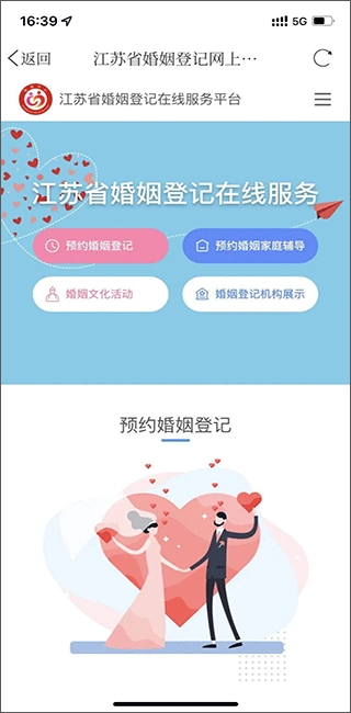 进入后我们能看到预约婚姻家庭辅导、婚姻文化活动、婚姻登记机构展示等在线服务板块,接着点击“预约婚姻登记”选项。