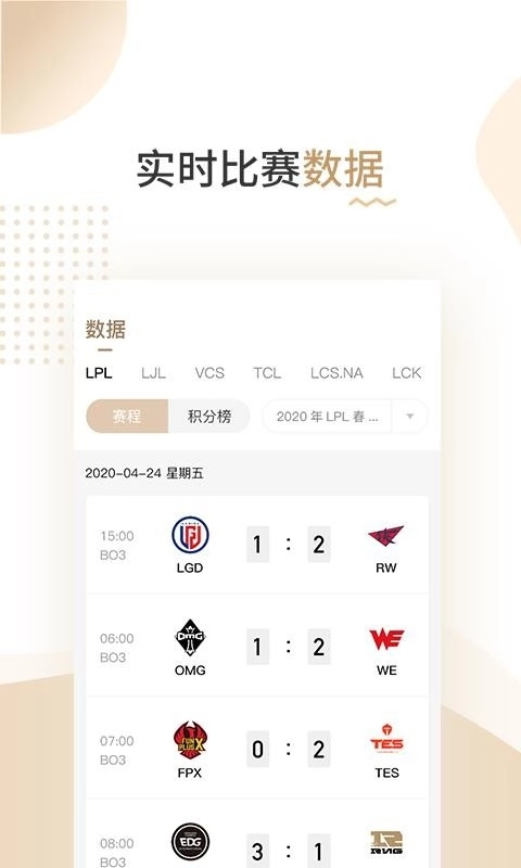 这款软件会为玩家提供实时的赛事信息,方便玩家轻松查阅自己喜欢的战队相关资料。