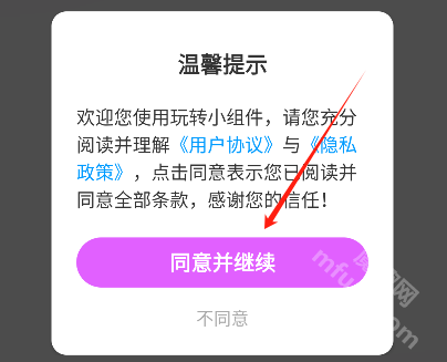 首先前往魔趣网(m.mfunz.com)并安装玩转小组件软件,随后点击“同意并继续”进入该软件。