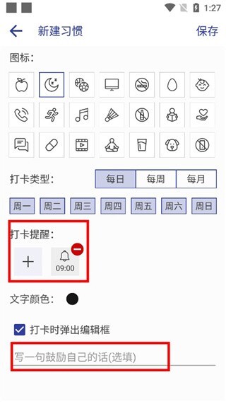 先确定好你的打卡任务,接着选择合适的打卡提醒时间,另外还能编辑一句用来鼓励自己的话语。