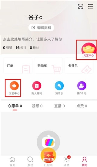 首先,新用户打开点淘后,点击右下角的“我的”选项,接着再点击“元宝中心”就能进入相应页面了。