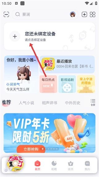 当运动健康和蓝牙设备成功连接后,打开喜马拉雅穿戴应用,在首页找到并点击“绑定设备”选项。